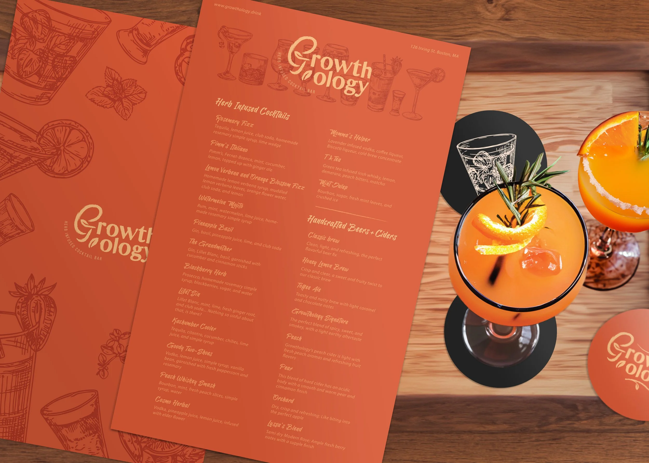 Growthology is an upscale cocktail bar that celebrates the fusion of fresh, homegrown herbs with expertly crafted drinks. Drawing inspiration from the 70s and the charm of natural botanicals, the visual identity combines vibrant orange gradients with hand-drawn illustrations and textured fonts to create a refreshing, upscale vibe.